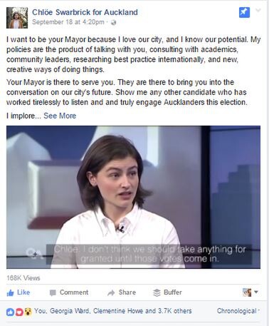 Like Malakai Fekitoa, Auckland mayoralty candidate Chloe Swarbrick is full throttle on the gas pedal coming down the centre of these local body elections and it's clear to see why. She knows her audience, she is great at showing that she cares about her publics and she has one almighty social media presence. Not to mention she is a frontrunner in being somewhat successful in engaging the 'unengageables' – a category predominantly made up of millennials.