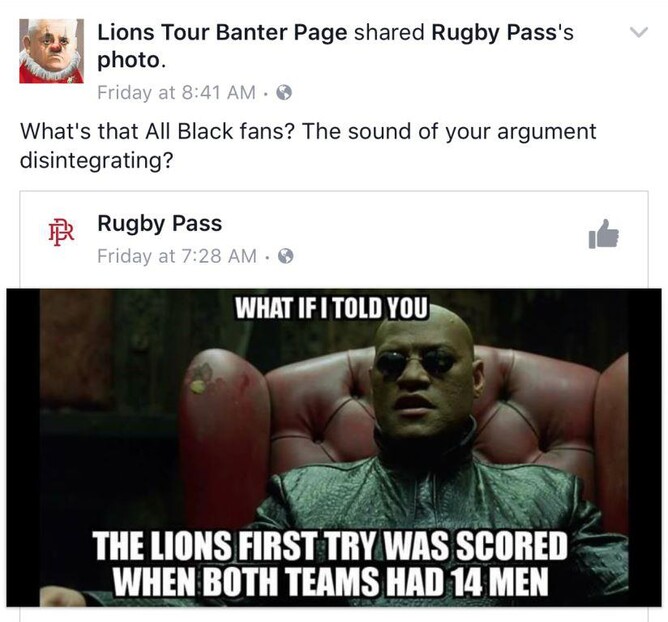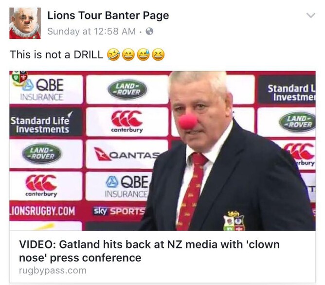 Their subsequent on-field resurgence – and ability to laugh at themselves (see the ever-excellent Lions Tour Banter Page on Facebook, right, for the final press conference after the Lions had drawn the series) gave us a lesson in taking criticism on the chin and then just getting on with it.