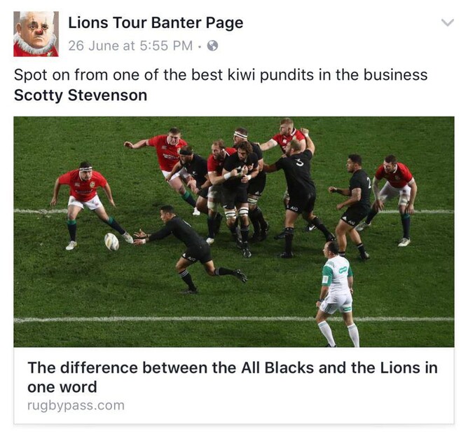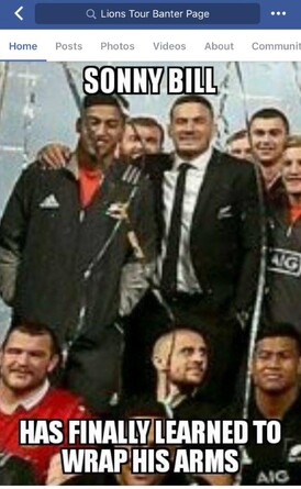 Firstly, after the second test match – won by the Lions 24-21 on a filthy night in Wellington – it seemed that some Lions fans were getting fed up with all the banter coming at them about how the Lions won the match only because the All Blacks were without star player Sonny Bill Williams for much of the match after he was red carded for not using his arms in a collision.