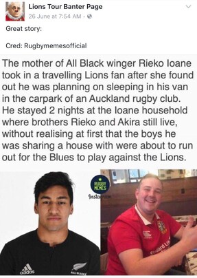 There were some real crackers during the tour. However, for me the standout was the tale of lonely travelling Lions fan Alex Edwards who ended up kipping on a mattress at the house of emerging All Blacks Rieko and Akira Ioane at the invitation of their mum Sandra when his accommodation fell through.